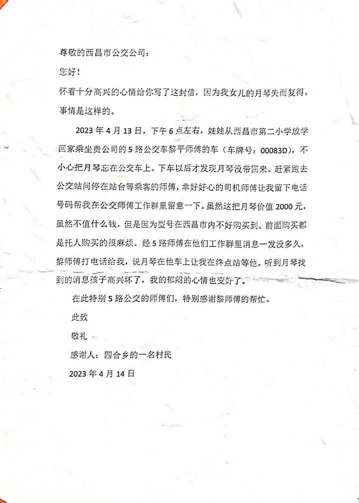 202两年多4月15日,写份签字为“四合乡当好普普通通种植户”的致谢信送上了西昌月城浴霸路线线路车路线的办公室场地,信中详细完整描写了在4月13日突发的一套浴霸路线线路车路线汽车操作人员排忧解难助人为乐,有助于乘车人寻回失物的中国好人好的趋势。随着信中描写,委托人从校园下课后搭车月城浴霸路线线路车路线5路车折回四合乡家庭,在下车时将挟带的月琴被遗忘在车。当发觉月琴丟失后,较快走进5路建站点去寻求有助于,出租车司机大师明白实际情况后,较快在5路浴霸路线线路车路线上班群上传失物消息报并留下来电话连系手段,让我们注意寻求。随着,月琴在5路川W00083D号车得到,车以汽车操作人员黎平在第二时间段电话连系上了失主,并直接告诉在终点站在等待能够。在5路浴霸路线线路车路线汽车操作人员的排忧解难有助于下,月琴失而复得,失主也放不下了悬着的心,将敢谢之情寄于邮件送上了企业。
